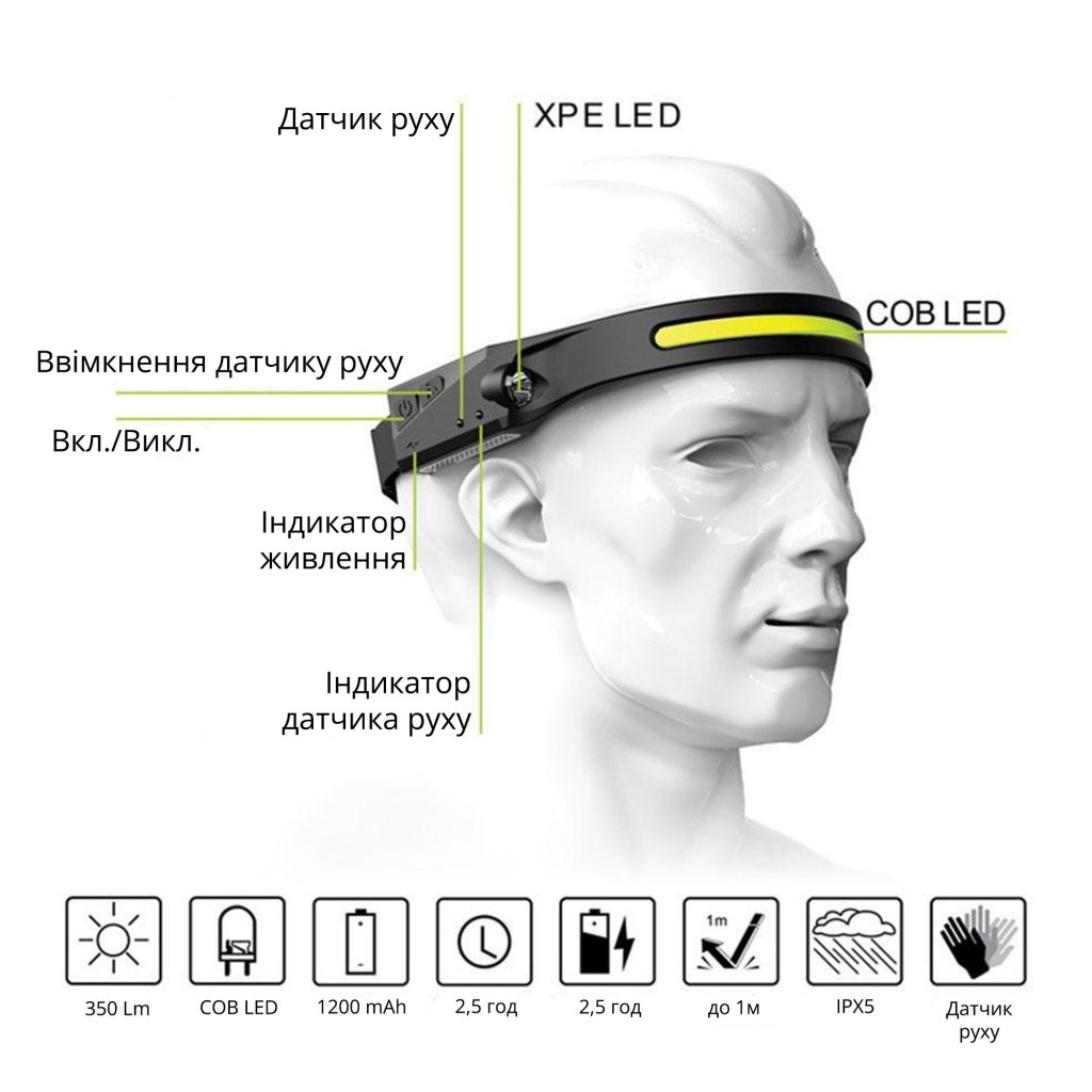 Легкий налобний ліхтар LED+COB з датчиком руху та вбудованим акумулятором (чорний)