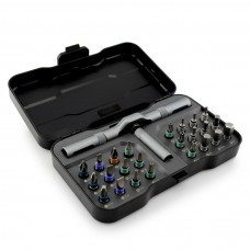 Комплект поставляється у спеціальному кейсі із міцного ABS-пластику. Для кріплення бітів на викрутку не потрібні додаткові інструменти, наконечник викрутки намагнічений і утримує біт і запобігає втраті шурупів під час відгвинчування. Наконечники викрутки мають невеликі розміри, тому такий набір можна застосовувати під час роботи з електронікою. Універсальну викрутку та насадки зручно зберігати у футлярі, який легко відкривається одним натисканням.